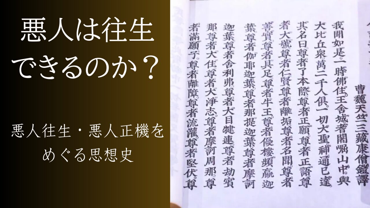 「悪人往生」とは、概して「悪人も往生できる(西方浄土に往き生まれ変わることができる)。悪人であっても救われる」ということです。